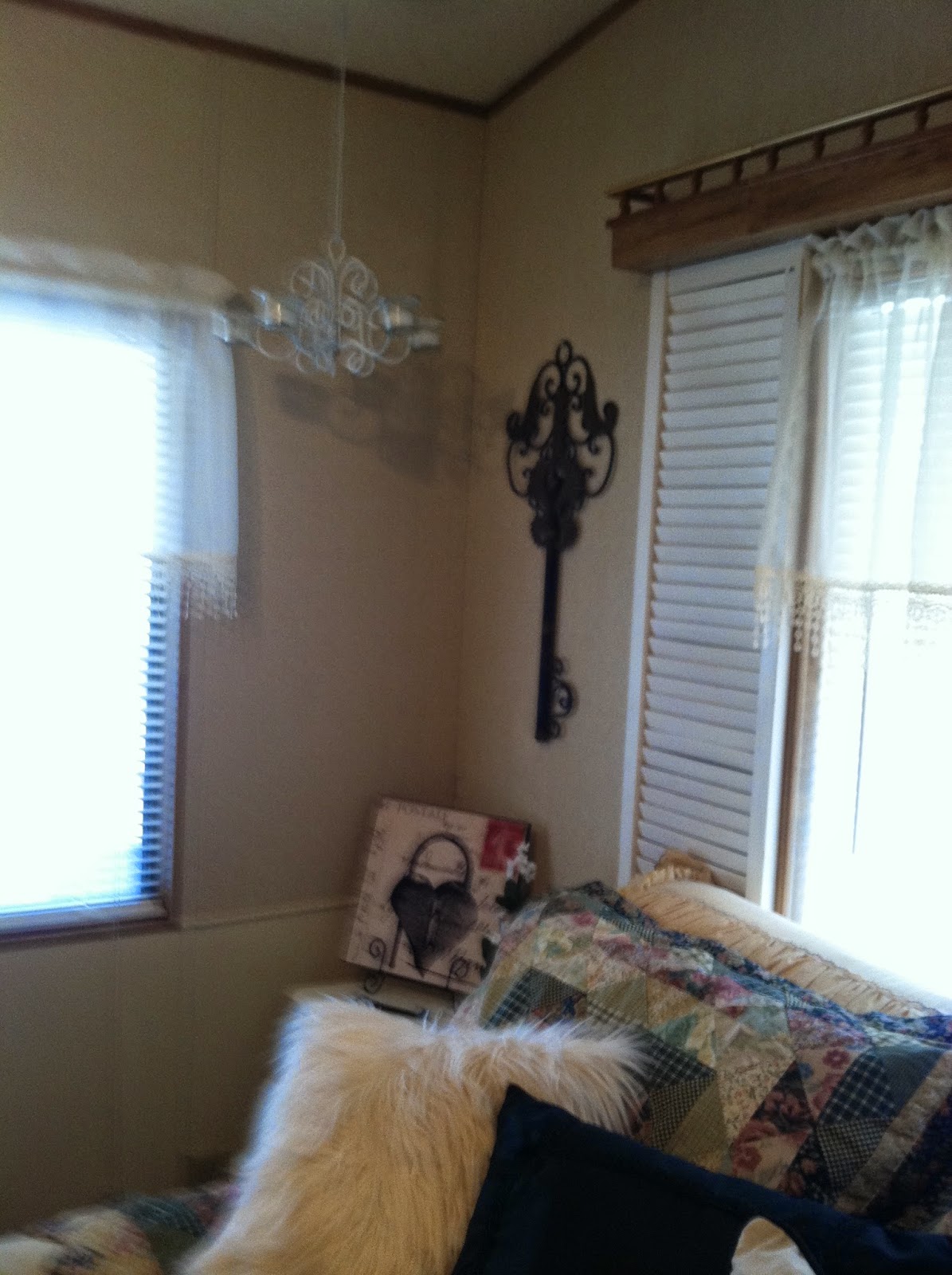 My favorite room at the cabin is our bedroom. I finally have a shabby chic ish room. Hubby kept it semi controlled!